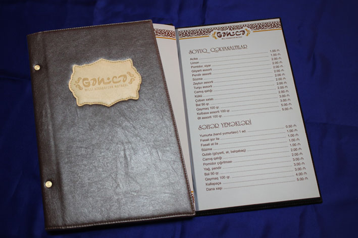 Dizayna uyğun olaraq menyunun hazırlanma qaydaları fərqli olduğundan qiymət barədə ofis-menecerimizlə əlaqə saxlayın. Hazırlanma müddəti dizaynın mürəkkəbliyindən və tirajdan asılı olaraq bir neçə günə qədər ola bilər.