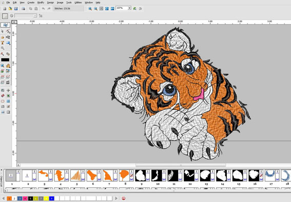 Преимуществами этой печати является долговечность, яркость красок и качество. Из минусов можно отметить время изготовления вышивальной программы и относительно низкая скорость нанесения. Изображения подготавливаются в графических программах, далее переводятся в специальный программный комплекс вышивальной машины, где преобразуются в программный код, понятный машине. Стоимость конечной продукции зависят от сложности изготовления начальной программы и количества итоговых стежков.
